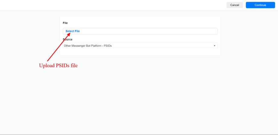 To import contacts from other bot platform, set the source as Other messenger bot platform and upload PSIDs