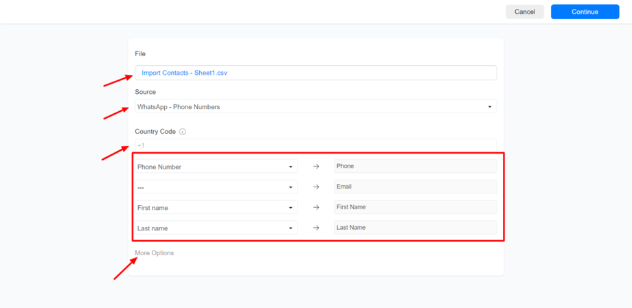 To import WhatsApp contacts or SMS contacts, Set the source to WhatsApp contacts or Phone (For SMS), Set the country code and upload .csv or .xlsx file. The ‘More Options’ option allows you to set custom field or add tag to the contacts.