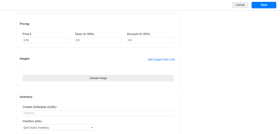 Pricing – The values of the product along with the price, tax details and discount percentage can be filled here. Note: Tax & discount fields are optional fields here.