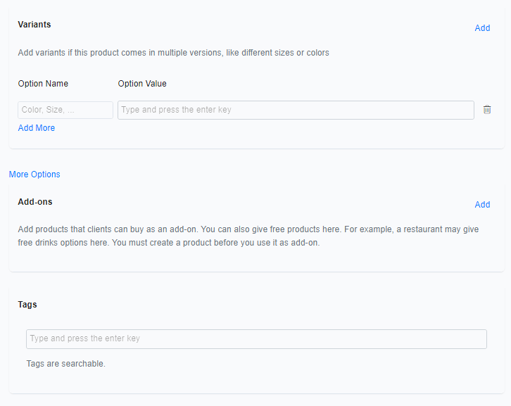Variants – Add the variants of your product like colour, size, quantity, and lot more based on your need.