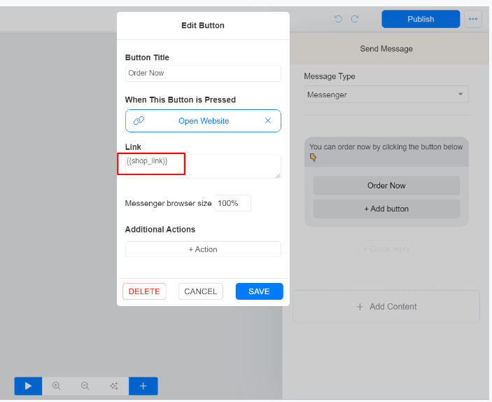 To let your customers access your web shop, use the system field {{shop_link}} as a button URL for channels that support buttons like Messenger or Telegram.