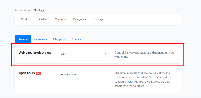 We provide many ways to display your products on the webshop. You can navigate to Ecommerce > Settings