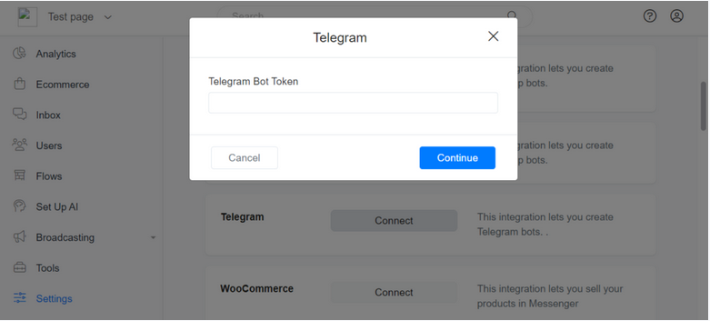 2 – Setup Telegram on Todook. Navigate to Settings > Integrations and find Telegram. You only need to specify your Telegram bot token and Todook will automatically integrate with Telegram and your bot is ready to respond to users.