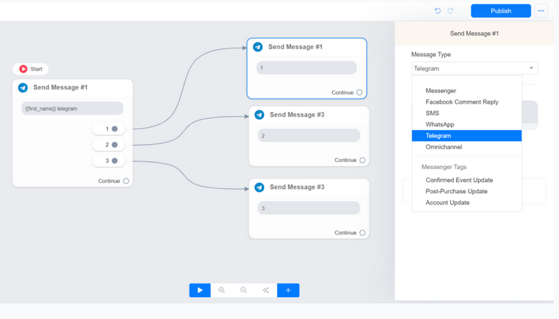 3 – On the flow builder, you will use Telegram or Omnichannel as a message type. We recommend that you use Omnichannel whenever possible.