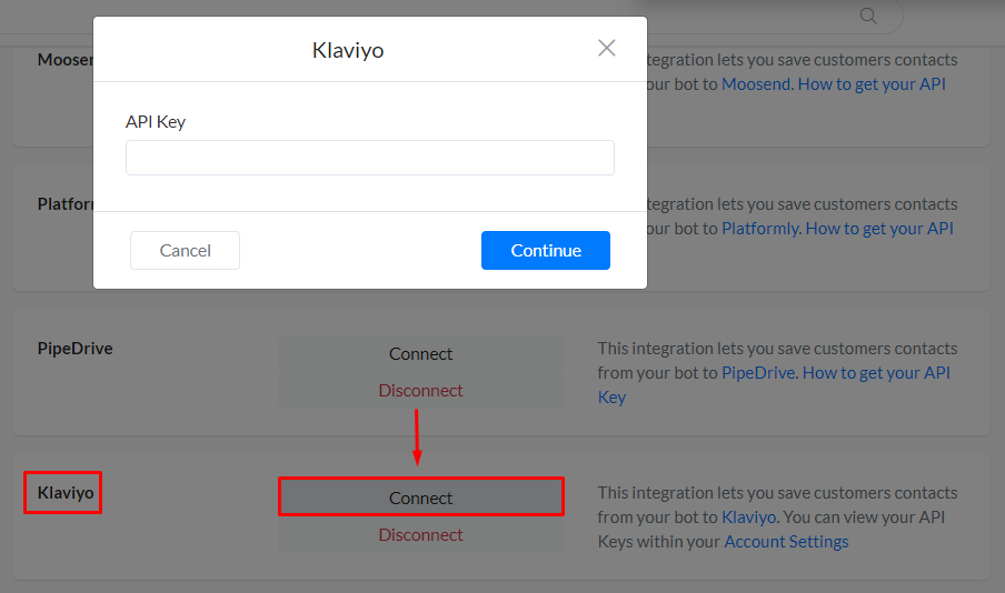 Step 3: Search for Klaviyo Integration and enter the API key to proceed further.